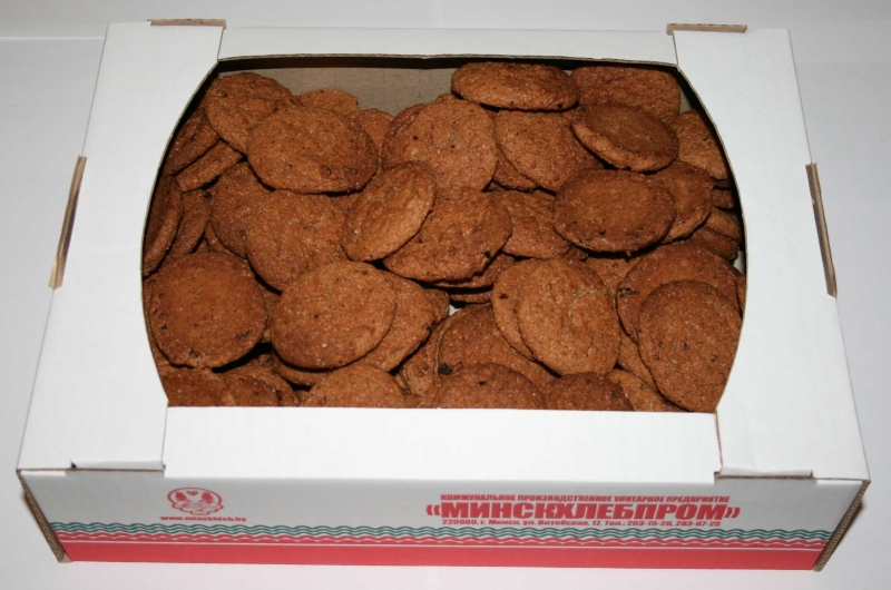 Энергетычная каштоўнасць: 416Апісанне прадуктуцукар, мука пшанічная першага гатунку, маргарын (алей раслінны рафінаваны дэзадараваны, алей раслінны мадыфікаваны рафінаваны дэзадараваны, вада, соль харчовая павараная ёдаваная, сыроватка сухая, цукар, эмульгатар- мона-і дiглiцэрыды тлустых кіслот, кансервант – бензаат натрыю, фарбавальнік - ?- каратын, араматызатар «Масла СМЕТАНКОВАЕ»), мука аўсяная, вінаград сушаны, разрыхляльнік- натрый двухвуглякіслы, соль павараная харчовая ёдаваная, араматызатар - ванабон, вада пітная.Умовы захоўванняЗахоўваць у добра вентыляваных памяшканнях, якія не маюць старонняга запаху, не заражаных шкоднікамі хлебных запасаў пры тэмпературы ад 10 °С да 26 °С і адноснай вільготнасці паветра не больш 80 %.